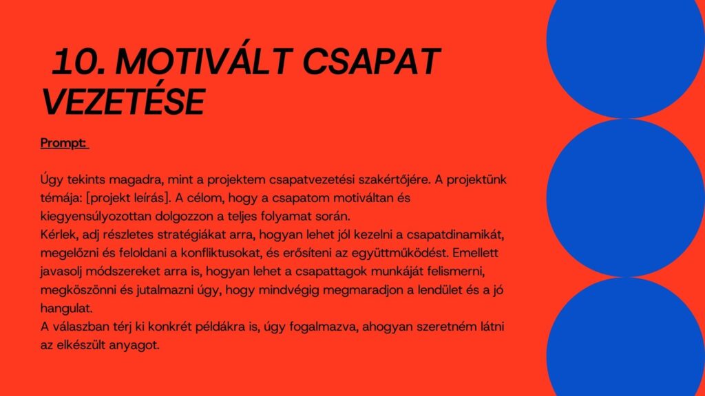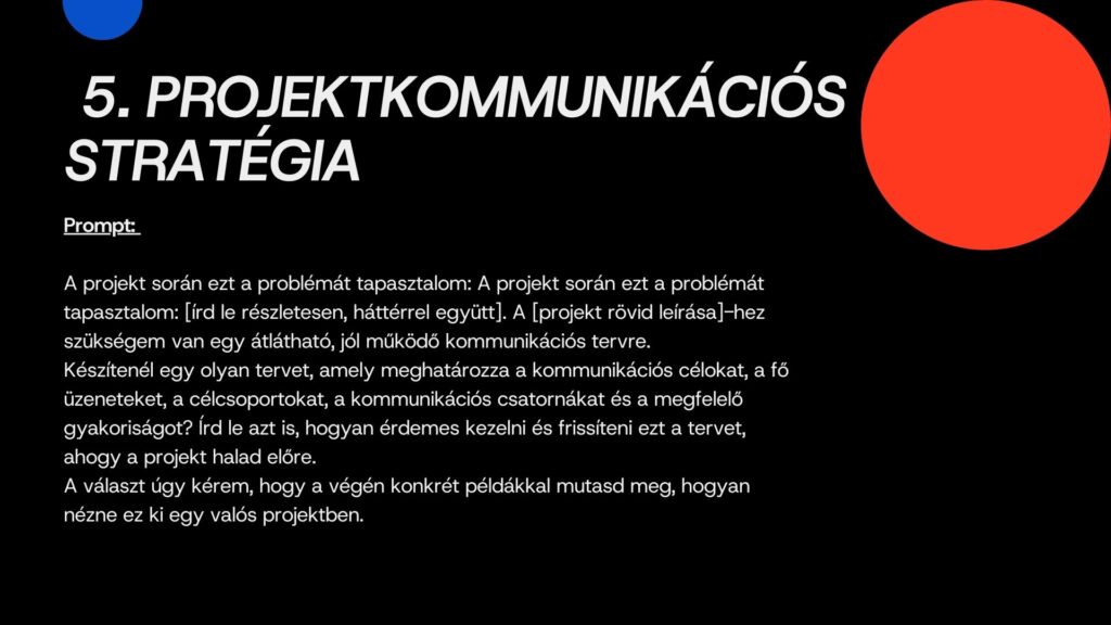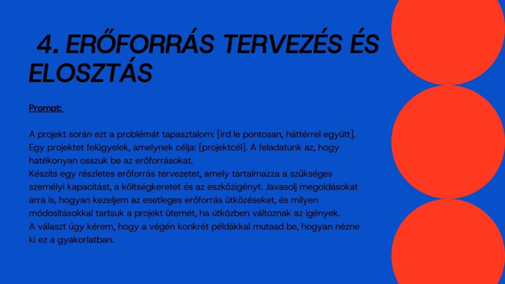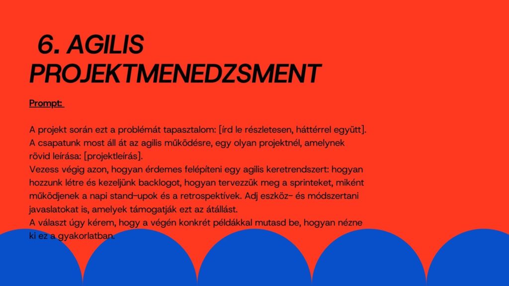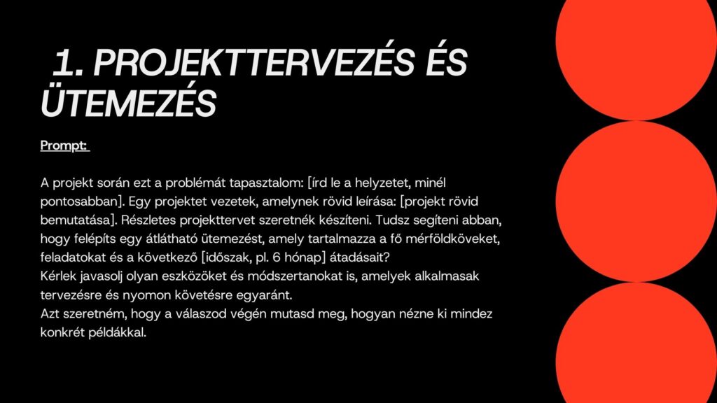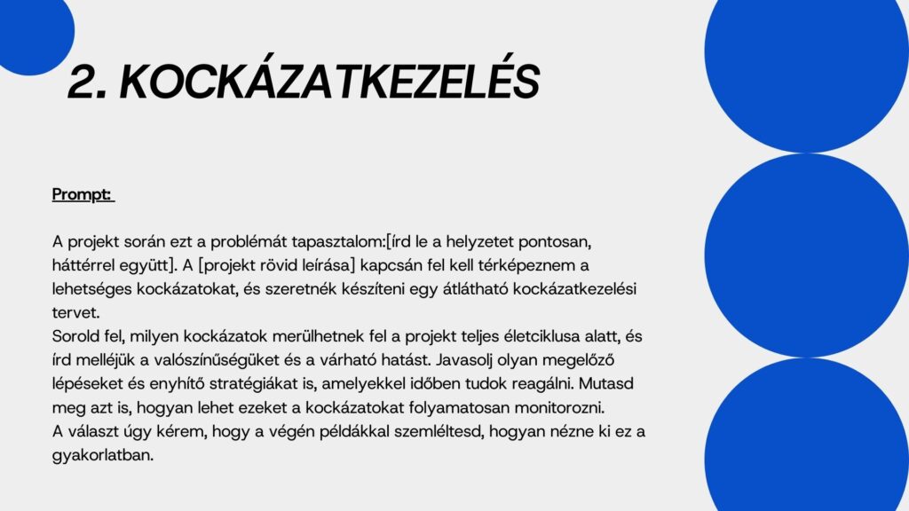 Ilyenkor jól jönne egy olyan társ, aki nem veszik el a részletekben, nem fárad el, nem kér újabb státuszmeetinget és észben tartja a határidőket. Ebben lesz segítségedre ez a tíz prompt. Mindegyik egy-egy olyan helyzetet ragad meg, ami a projektekben rendszeresen felbukkan. Végigvezet a tervezéstől a lezárásig, tiszta logikával és érthető lépésekkel. A cél nem az, hogy a projektvezető átadja a munkát a mesterséges intelligenciának, hanem hogy nagyobb tere legyen az emberi döntéseknek. Ezek a promptok ebben lesznek társak.