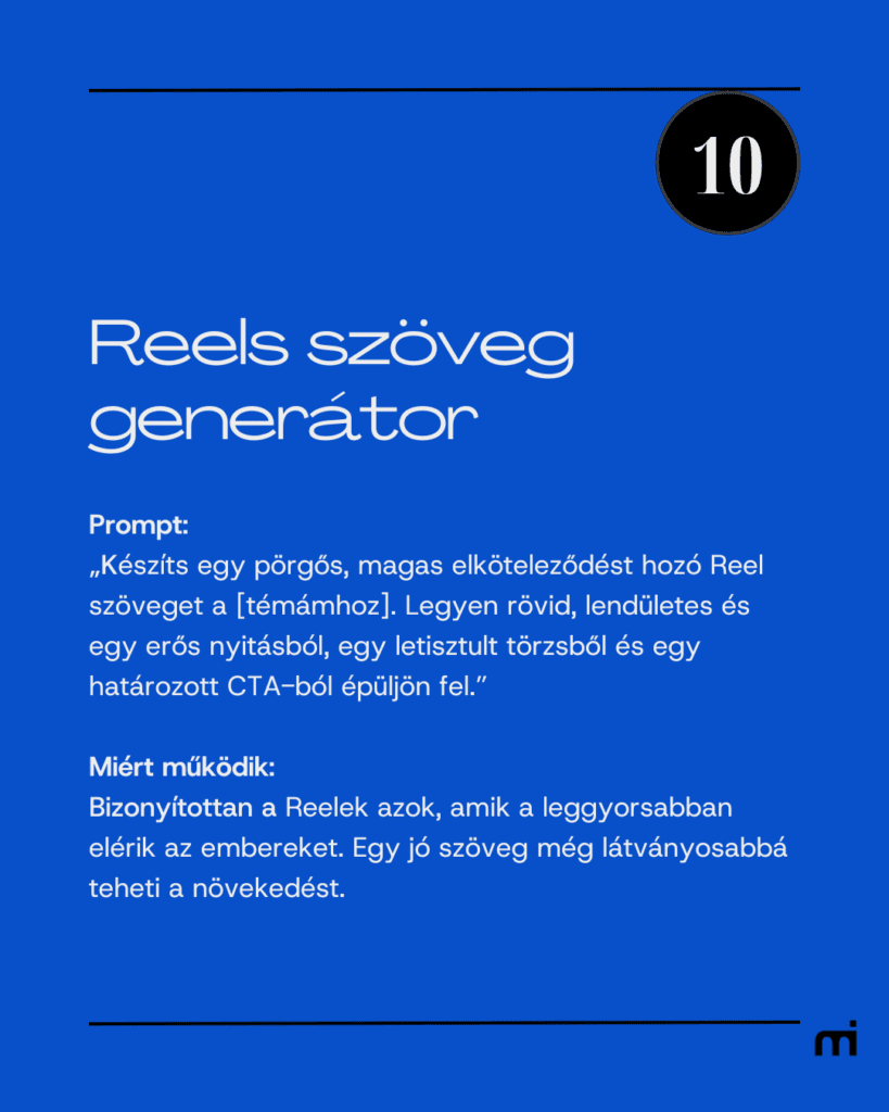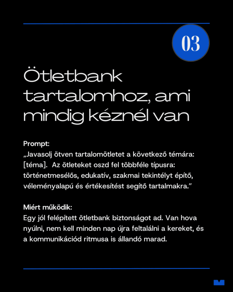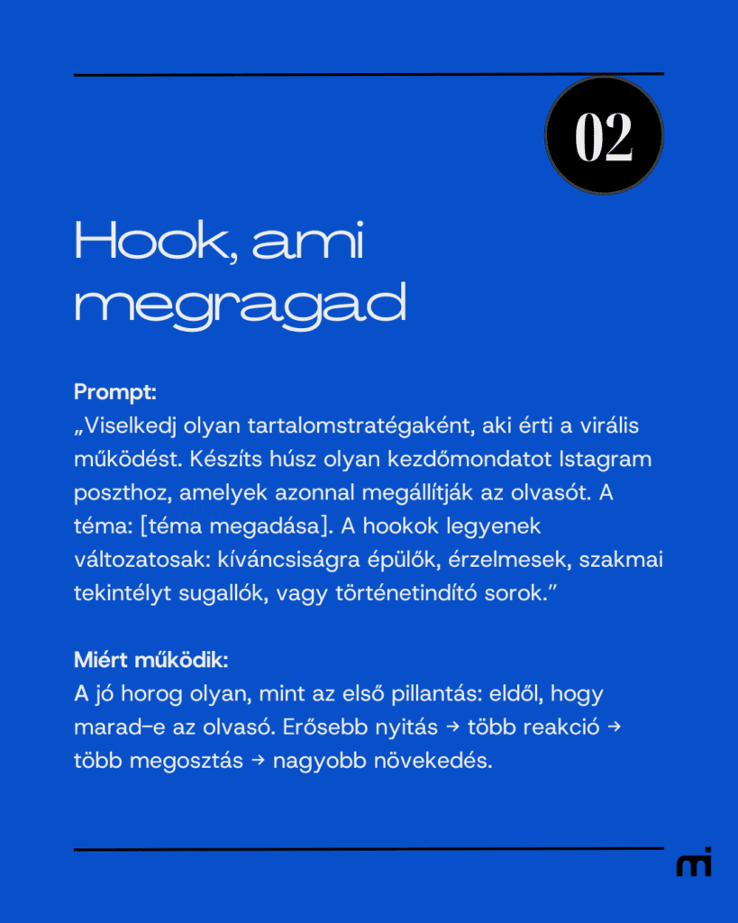 Az alábbi promptok a mindennapi tartalomgyártás legnehezebb részét veszik le a válladról: az elindulást. Tiszta, használható promptok, amelyek mellett gyorsabban döntesz, és biztosabban haladsz.