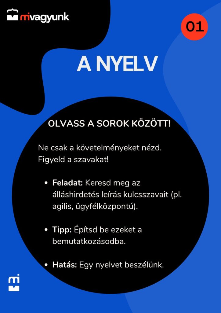 A legtöbben csak átfutják az állás leírását, és megnézik, megvan-e a kért 3 év tapasztalat. Ez hiba. A hirdetés szövege ugyanis a kulcs a HR-es szívéhez. Figyeld meg a nyelvezetet! Ha a cég ügyfélélményről beszél, ne vevőkezelést említs. Ha agilis módszertant írnak, te is ezt a terminológiát használd.