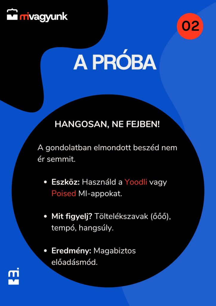 Gondolatban mindenki profi szónok. Aztán amikor ki kell mondani a mondatokat, jön az ö-zés, a szóismétlés és a hadarás. A gyakorlásnak hangosnak kell lennie. És itt jön a képbe a technológia. Ma már nem kell a tükör előtt állnod. Használj olyan MI-alapú kommunikációs trénereket, mint a Poised vagy a Yoodli.