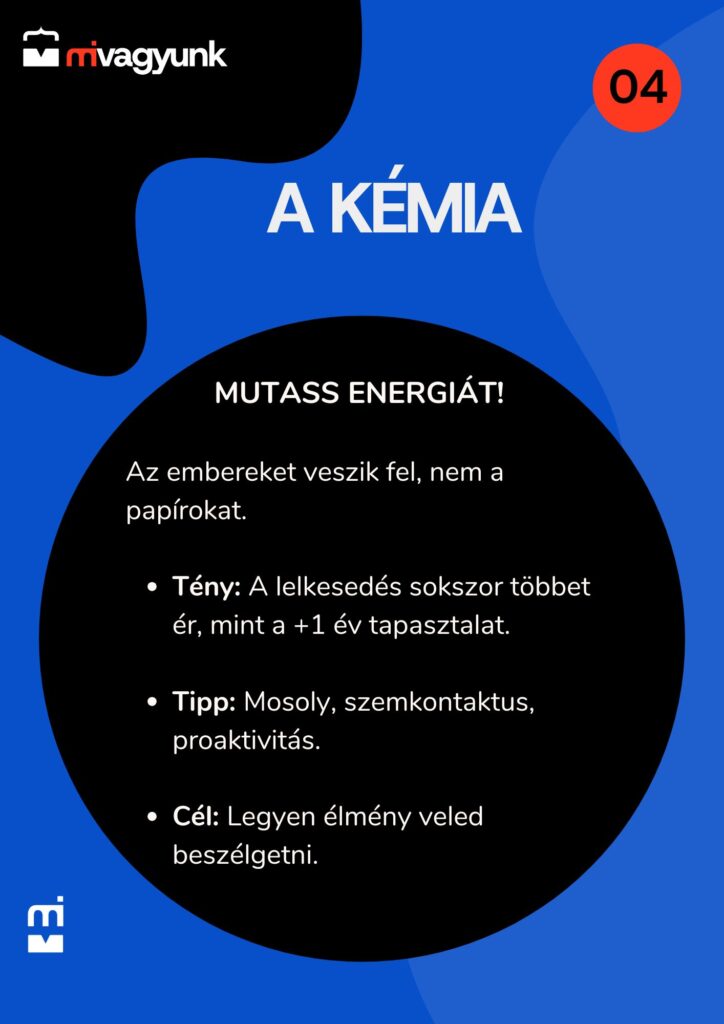 Sokan alábecsülik a lelkesedést. Pedig a kiválasztást végzők is emberek. Olyan kollégát keresnek, akivel jó lesz együtt dolgozni, nem egy robotot. A szakmai távolságtartás gyakran tűnik érdektelenségnek. Mutasd meg, hogy érdekel a feladat! Mosolyogj, használd a gesztusaidat. Az energia ragadós, ha te lelkes vagy a projekt iránt, ők is lelkesek lesznek irántad.