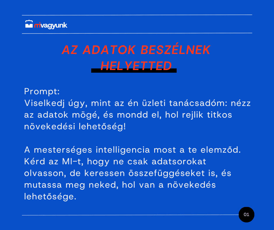 Az adatelemzés nem amolyan elit foglalatosság: ha jól teszed fel a kérdéseket, a mesterséges intelligencia segít abban, hogy az adataidból cselekvési terv legyen. Akár azonnali gyorssegély, akár hosszabb távú fejlődés a cél.