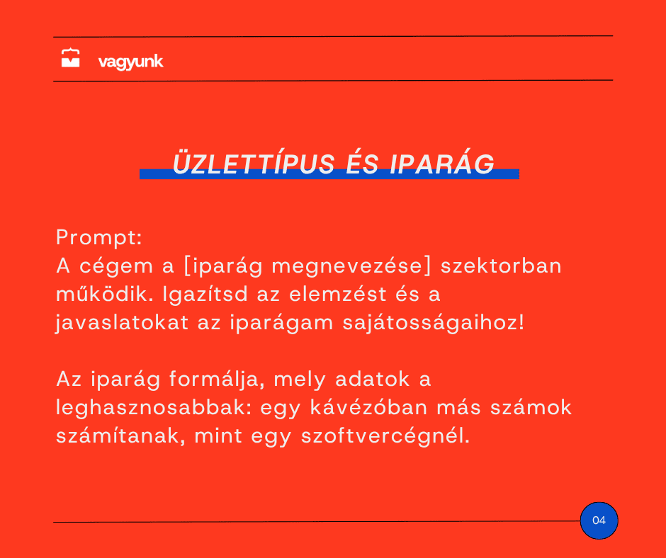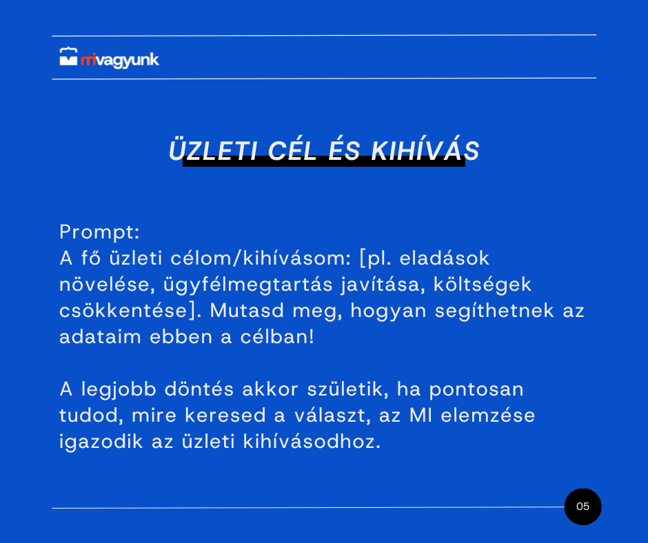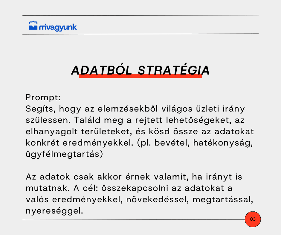 Olyan promptgyűjteményt kapsz, amit bármely mesterséges intelligenciával használhatsz, ezzel a legfontosabb üzleti kérdésekre kapsz választ. Legyen szó növekedésről, költségoptimalizálásról vagy ügyfélmegtartásról.