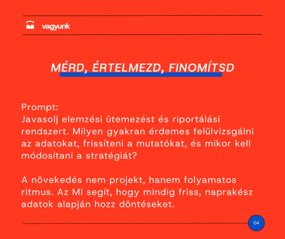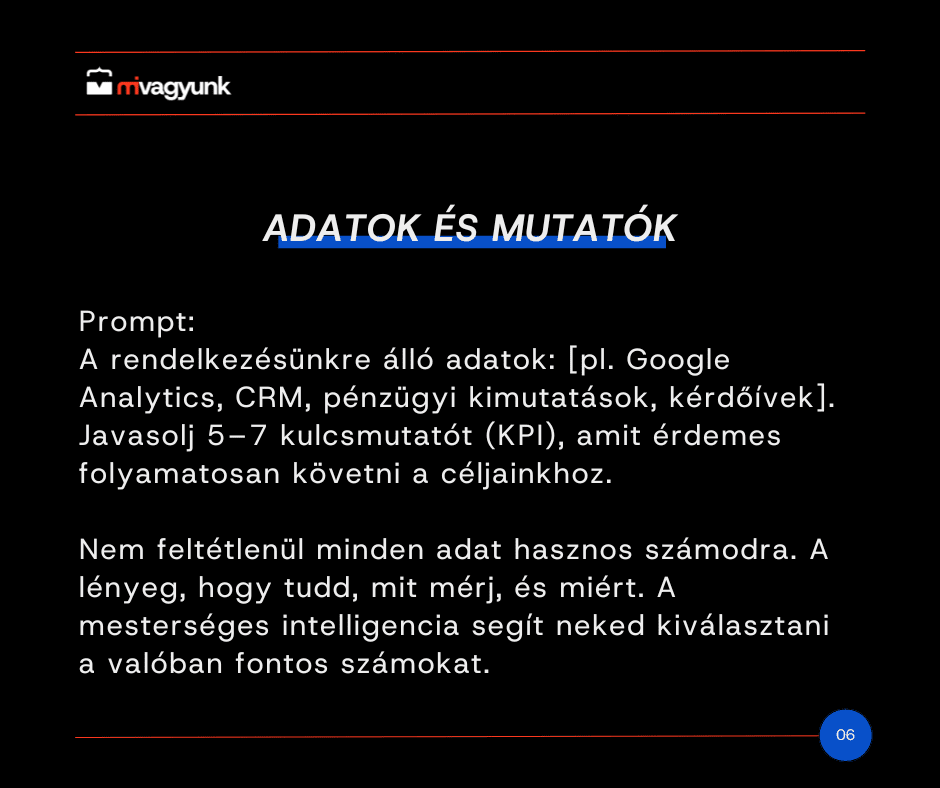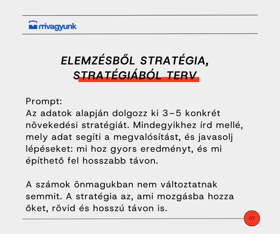 Segítünk megtalálni azokat a pontokat, ahol a legnagyobb javulás érhető el, és megmutatjuk, hogyan lesz a többlet információból értelmesebb döntési folyamat. A promptokkal ki tudod választani azt is, mely mutatók számítanak valóban, és milyen gyakran érdemes elemezni vagy újragondolni az eredményeket.