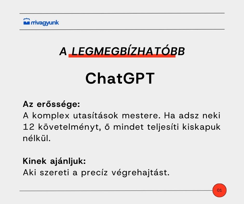 Ha egyetlen szóval kellene jellemezni a ChatGPT-t, az az engedelmesség lenne. Ez az eszköz a bonyolult utasítások mestere. Képzeld el azt a helyzetet, amikor átadsz egy tizenkét pontból álló összetett ellenőrzőlistát. A ChatGPT az a munkatárs, aki mind a tizenkét pontot végrehajtja, és nem hagy ki semmit. Ezzel szemben a Gemini például híres arról, hogy hajlamos a könnyebb utat választani, és levágni a kanyarokat. Ha precizitásra és összetett szabályok betartására van szükséged, akkor ez a te eszközöd.