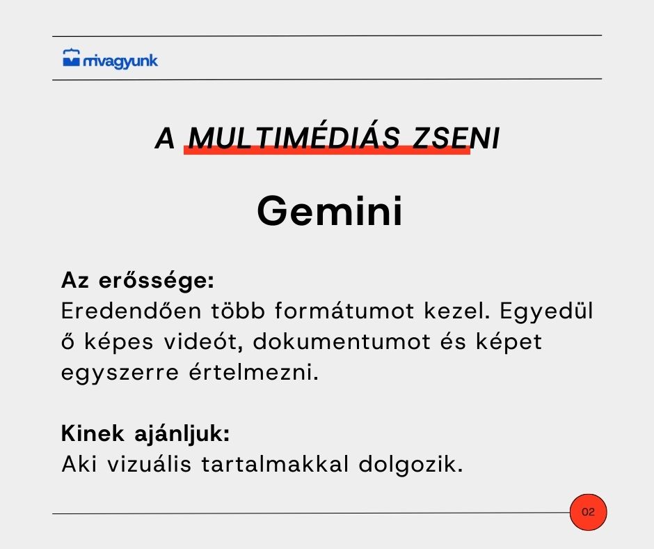 A Google megoldása, a Gemini az egyetlen olyan modell, amely eredendően képes több formátumot egyszerre kezelni. Ez azt jelenti, hogy nem kell külön-külön bajlódnod a fájlokkal. Feltölthetsz neki egy videofelvételt, egy prezentációt és egy fotót a fehértábláról egyetlen üzenetben. A Gemini képes ezeket szintetizálni, és összefüggéseiben látni az összes forrást. Ha vizuális anyagokkal vagy videókkal dolgozol, a Gemini verhetetlen.