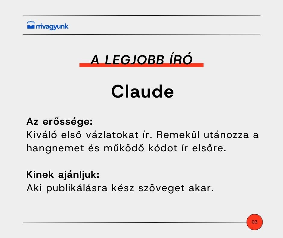 Ha az első vázlat minősége számít, akkor a Claude a befutó. Ez a modell képes a leginkább emberi hangnemet megütni, és kiválóan utánozza a te saját stílusodat. Nem csak a szövegírásban jeleskedik, hanem a programozásban is. Tapasztalatok szerint ez az eszköz készít leggyakrabban működő kódot már az első próbálkozásra. Ha fontos a természetes fogalmazás és a kreatív írás, a Claude lesz a kedvenced.