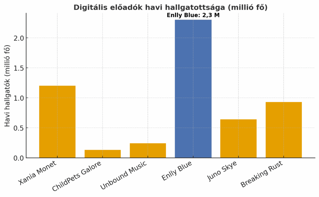 A diagram mutatja, hogy Enlly Blue vezeti a mezőnyt havi 2,3 millió hallgatóval, míg Xania Monet 1,2 millióval a második helyen áll.