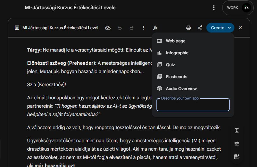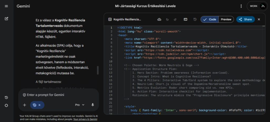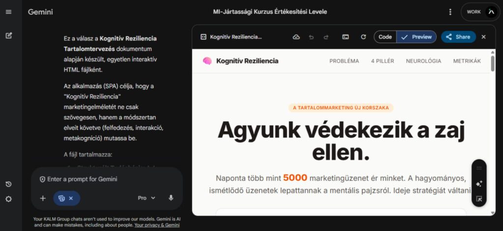 A céges belső adatok és kutatások rendszerezésére, a Google NotebookLM rendszere a legalkalmasabb. Ennek és a Canvas felületének az összekapcsolása hatalmas üzleti lehetőségeket rejt. A saját feltöltött dokumentumaink és ügyfélfelméréseink alapján, a gép képes egy komplett működő weboldalt legenerálni. A weboldal nem kitalált általános adatokat tartalmaz, hanem szigorúan a mi információinkra és felméréseinkre építkezik.