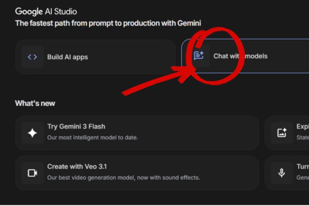 A Google AI Studio kezdő képernyője, a chat ablak választással