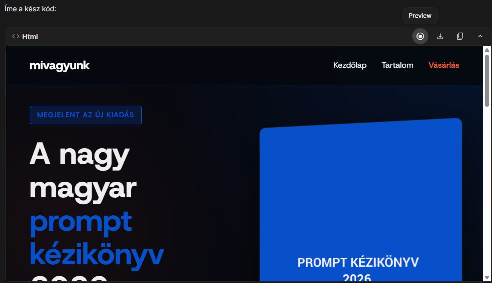 Amint végzett (általában 30-60 másodperc), a jobb felső sarokban vagy a kódablak tetején megjelenik egy Preview (Előnézet) gomb, ami gyakran egy kis szem ikon vagy egy „Run” feliratú gomb, attól függően, épp melyik verziót használod. Ha nem látod, akkor másold ki a kódot, a jobb felső sarkában lévő másolás ikonnal.