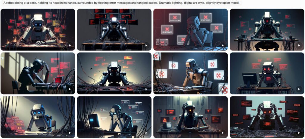 „Egy robot ül az íróasztalnál, a fejét fogja a kezében, körülötte lebegő hibaüzenetek és összegabalyodott kábelek. Drámai világítás, digitális művészeti stílus, enyhén disztópikus hangulat.”