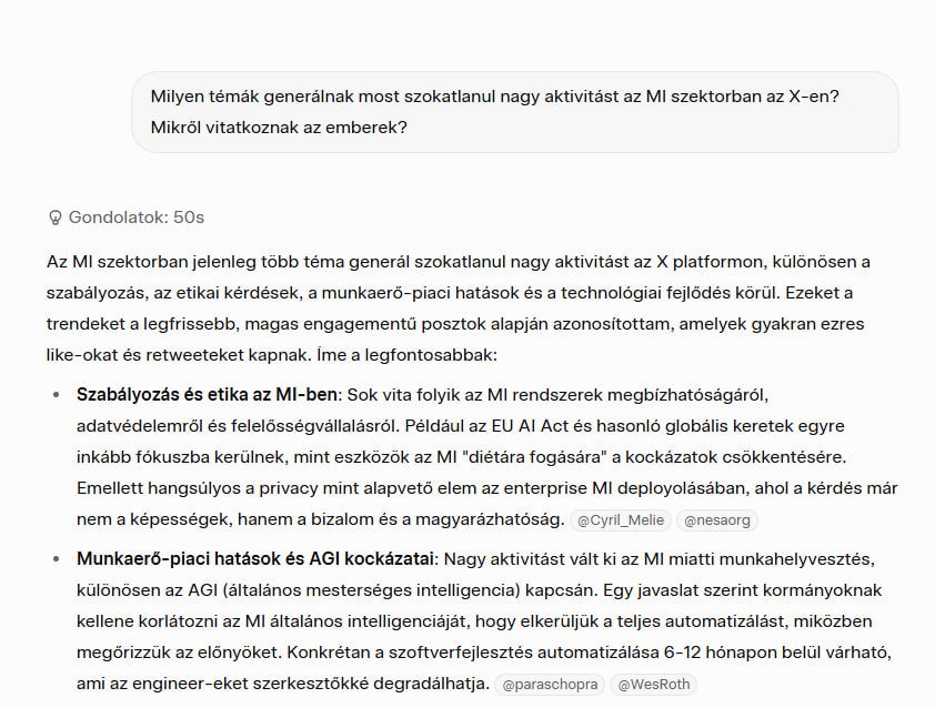 „Milyen témák generálnak most szokatlanul nagy aktivitást az MI szektorban az X-en? Mikről vitatkoznak az emberek?”