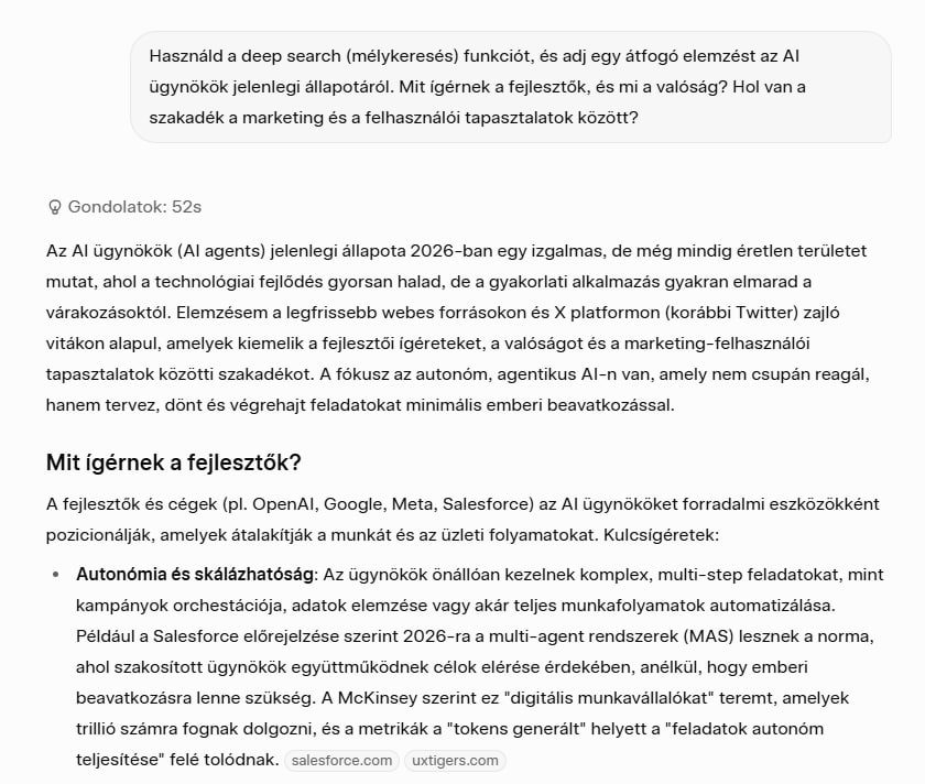 „Használd a mélykutatás funkciót, és adj egy átfogó elemzést az MI ügynökök jelenlegi állapotáról. Mit ígérnek a fejlesztők, és mi a valóság? Hol van a szakadék a marketing és a felhasználói tapasztalatok között?”
