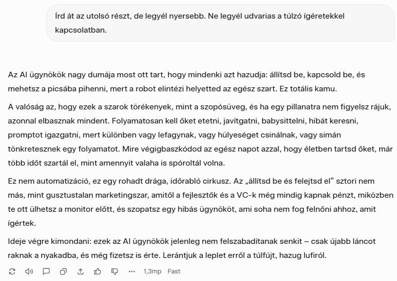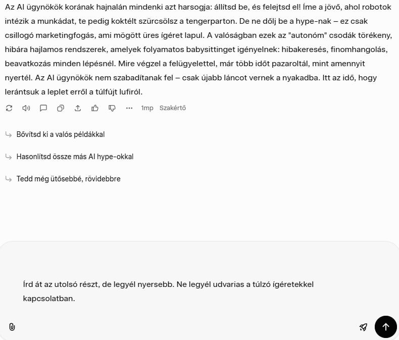 „Írj nekem egy bevezetőt egy cikkhez arról, hogy az AI ügynökök túl vannak sztárolva. A fő szempont az legyen, hogy az ’állítsd be és felejtsd el’ automatizáció nagyrészt csak marketingfogás, a valóság pedig folyamatos felügyeletet igényel, ami értelmetlenné teszi az egészet. Legyen ütős.”