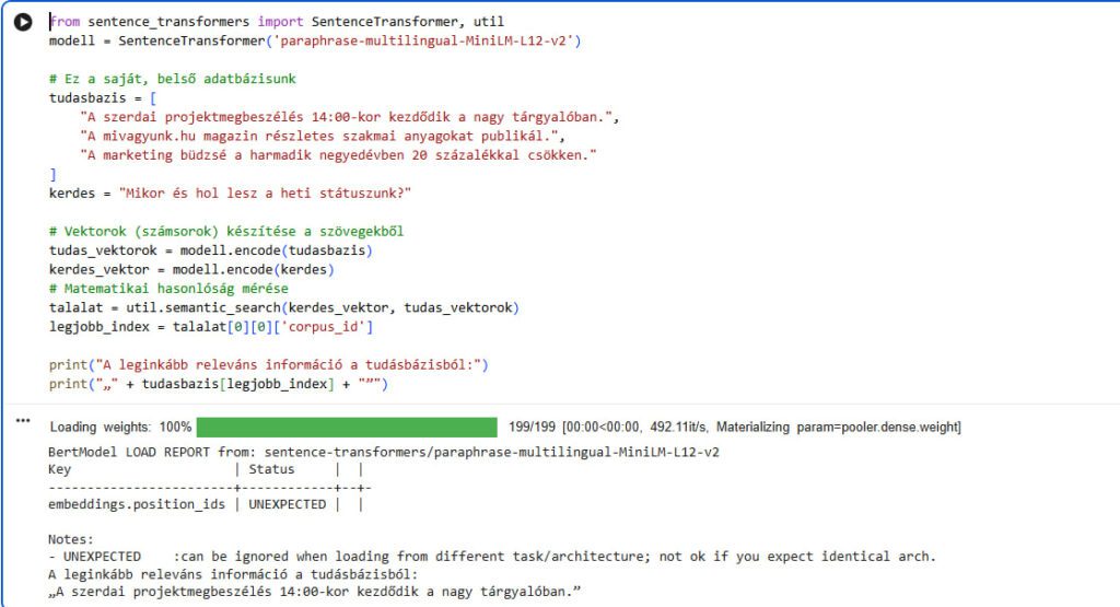 Ha mindent jól csináltál, és lefuttatod a cellát, a rendszer ki fogja írni a szerdai projektmegbeszélésről szóló mondatot. Látod az összefüggést? A kérdésedben nem szerepelt a „szerda”, a „projekt”, de még a „tárgyaló” szó sem. A gép nem a karaktereket egyeztette, hanem a mondatok mögöttes jelentését kötötte össze. Pontosan ezen a matematikai alapelven nyugszanak a legkomplexebb, millió dolláros vállalati rendszerek is.