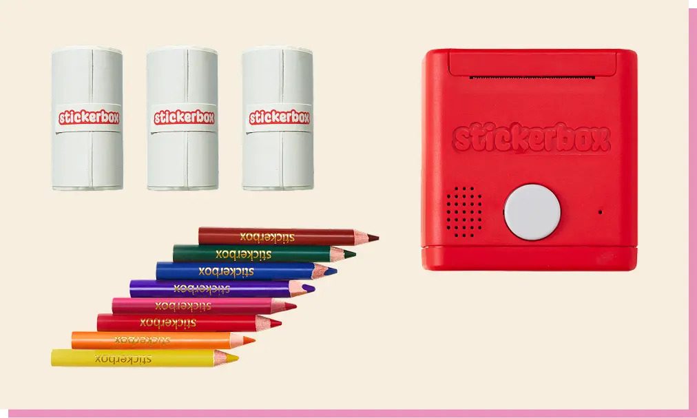 A Stickerbox első ránézésre egy kis piros játékdoboz, amelyik matricát nyomtat. A gyerek elmondja, mit szeretne látni, a doboz pedig kirakja neki egy fekete-fehér rajz formájában. A matrica letéphető, kiszínezhető és bárhová felragasztható.