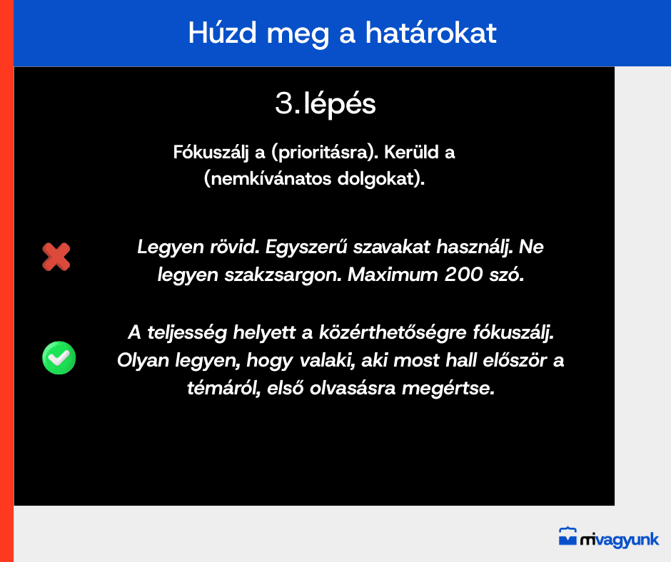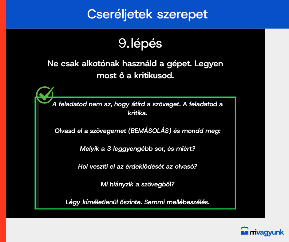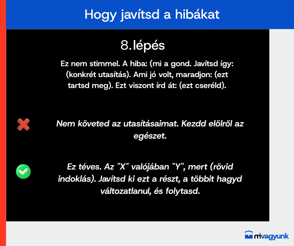 Összeállítottunk egy kilenc lépésből álló útmutatót, amely rendszerezi a hatékony utasításadás alapjait. Ezek a kártyák a mindennapi munka során kikísérletezett, működő módszerek. Sorra vesszük a siker mércéit, a példák erejét és a tiltólisták használatát. Sőt, azt is meg tanulhatod, hogyan vedd rá a rendszert, hogy magától javítsa a tévedéseit. Ha ezeket a szabályokat beépíted a napi rutinodba, az MI azonnal hatékonyabb munkatársaddá válik.