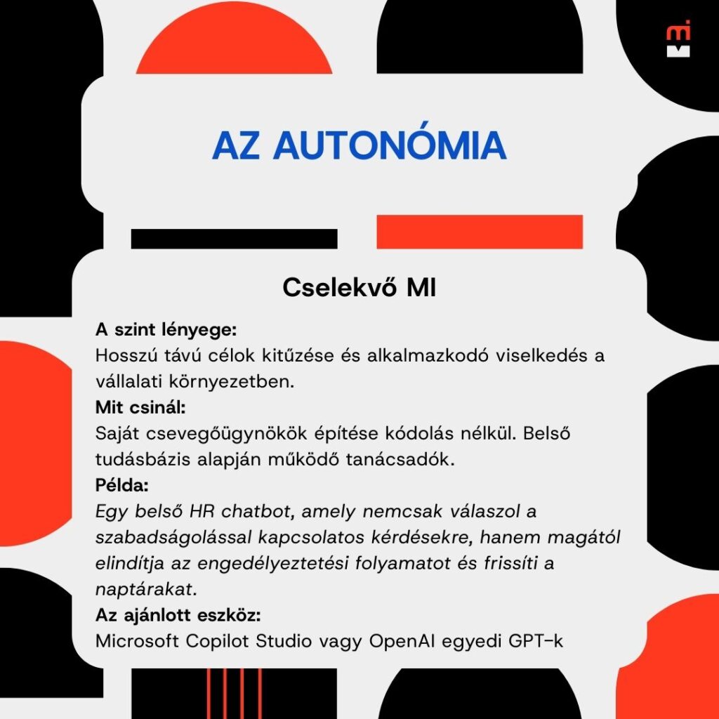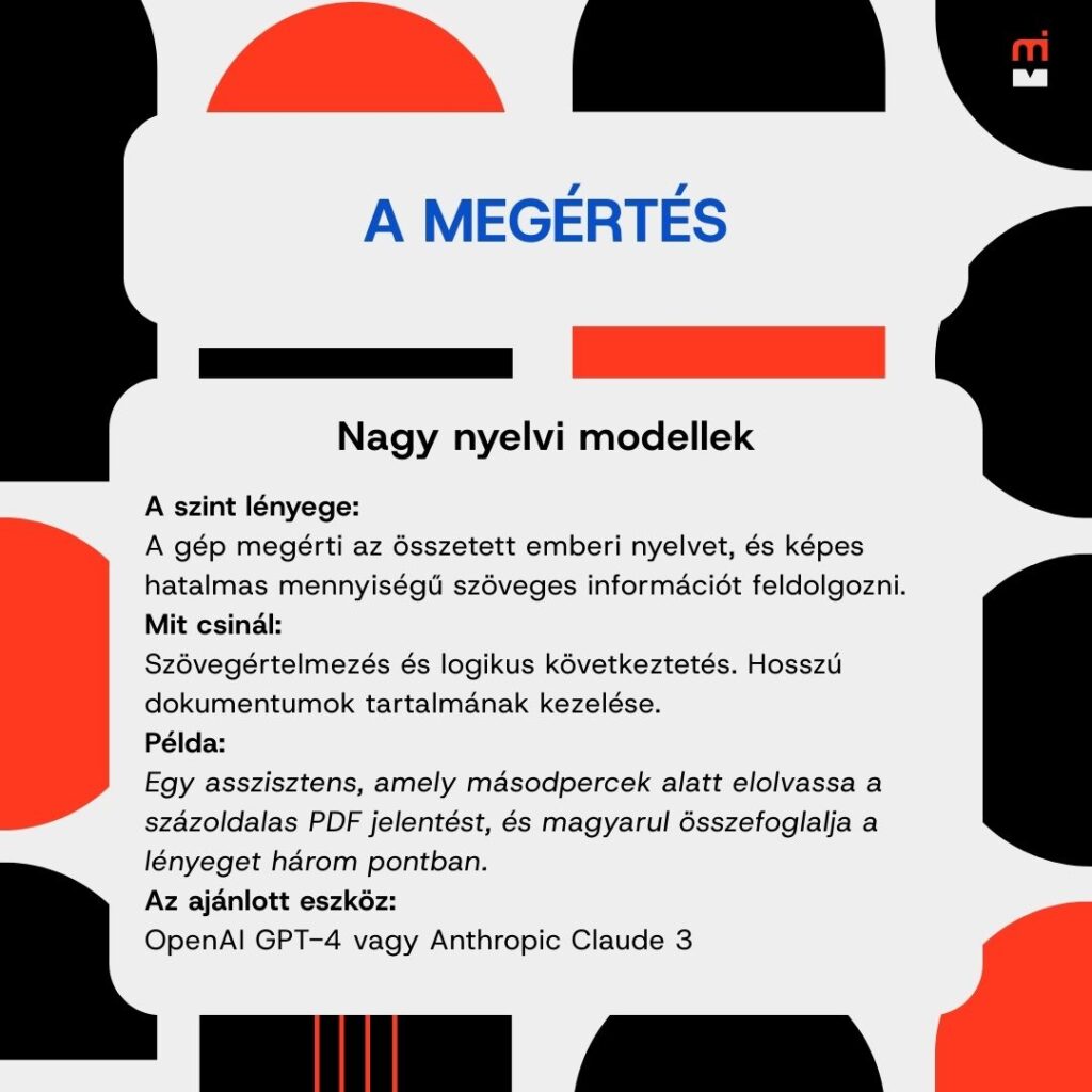 A mivagyunk.hu szerkesztősége szerint elengedhetetlen, hogy tisztán lássuk ezeket a technológiai rétegeket, mert a jövő beruházásai ezen múlnak. Nem mindegy, hogy egy okos beszélgetőpartnerre költjük a cég erőforrásait, vagy egy olyan digitális munkaerőre, amely képes önállóan elvégezni a munkát helyettünk. Ezért lebontottuk ezt a komplex technológiát hét jól elkülöníthető rétegre. Ez a struktúra segít megérteni, hogyan épülnek egymásra a szintek a puszta adatfeldolgozástól kezdve, egészen a teljes autonómiáig és a szigorú biztonsági felügyeletig. A lenti kártyákon bemutatjuk azt a hét lépcsőfokot közismert és elérhető piaci szoftverekkel illusztrálva.