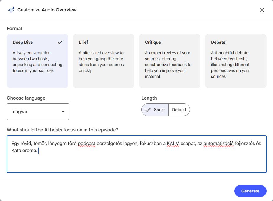 - Miután feltöltötted, keresd meg a „Hangos áttekintés” (Audio Overview) rész jobb felső sarkában lévő kis szerkesztő ikonra. Itt állíthatod be a podcast adásod részleteit: nyelv, hossz, mire helyezze a fókuszt a beszélgetés. Ha ezzel megvagy kattints a Generálás (Generate) gombra.