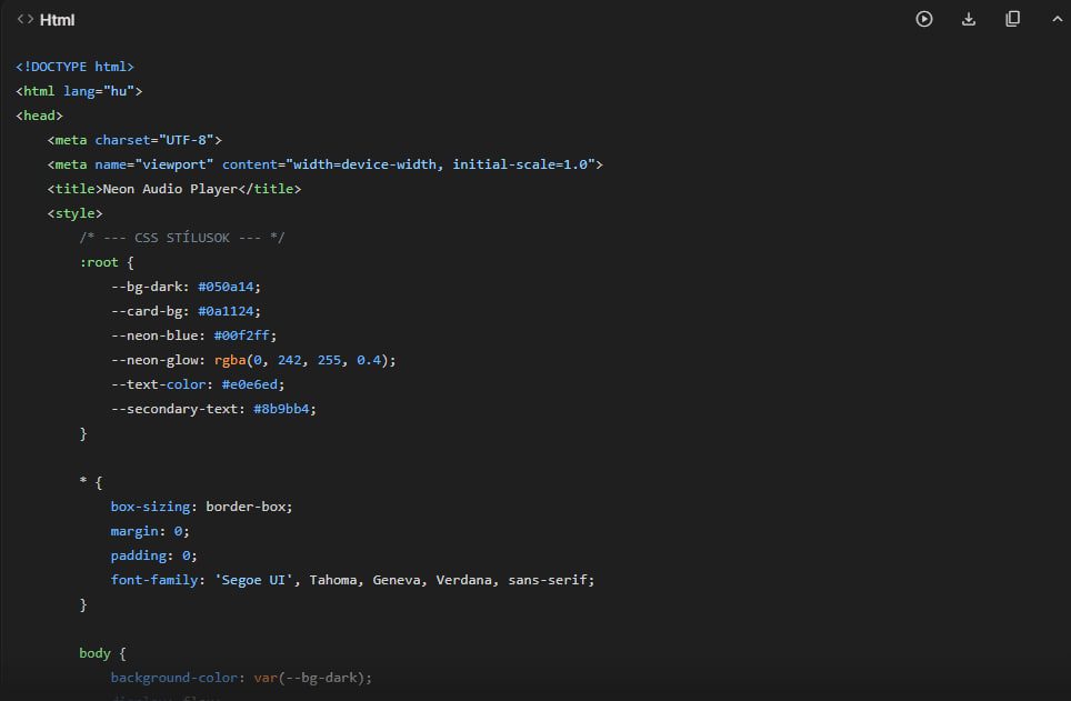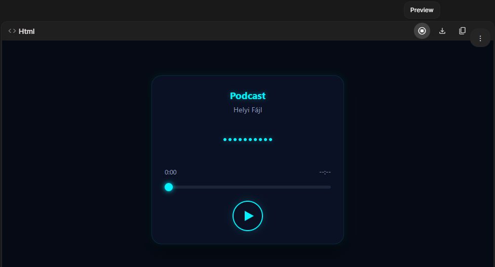 Dizájn A téma legyen sötétkék és neon kék (#00f2ff) futurisztikus stílusban. A lejátszó kártya legyen lekerekített és árnyékolt. Tartalmazzon egy Lejátszás és Szünet gombot, egy folyamatjelző sávot (progress bar), és az eltelt időt. Helyezz el egy látványos hanghullám (waveform) animációt, ami mozog, amikor szól a zene.