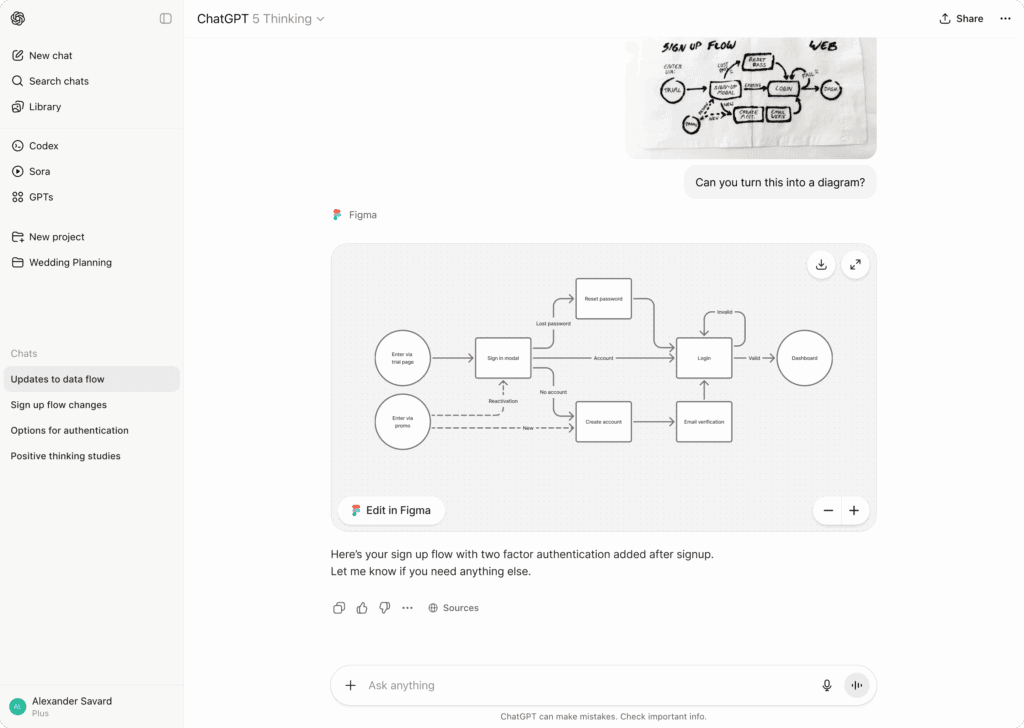 A ChatGPT képes vizualizálni a fő lépéseket, majd automatikusan létrehozni egy szerkeszthető vázlatot a Figma-ban. Emellett projektterveket, mérföldköveket és határidőket is készíthet, hogy a csapatod átláthatóan dolgozzon.